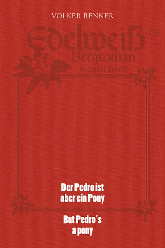 Wie auch in seinem parallel erschienen Künstlerbuch „Wo waren Sie, Herr Renner? oder ein Mangel an Information“ experimentiert Volker Renner mit dem Zusammenwirken von Bild und Text. In „Der Pedro ist aber ein Pony“ arbeitet der Künstler mit gefundenem Material, das er in einem schmerzvollen Prozess aus Heimatromanen extrahiert hat. Wie absurd und versponnen das Heimatbild und wie „einfach gestrickt“ diese literarische Gattung ist, zeigt der Künstler, indem er den Titelbildern Dialogsätze aus dem jeweiligen Roman gegenüberstellt. Bild und Text überlagern sich in ihrer erzählerischen Funktion und verstärken sich gegenseitig zu einem Gesamtbild, das die Größe der Gesten und der Gefühle in ungeahnte Höhen treibt und ihr Ausmaß an Absurdität freilegt. Vor dem Auge des Betrachters entwickeln sich Bilder von Waffen und Wiesen. Und, es sei verraten, der Verleger wollte einen anderen Schluss.