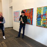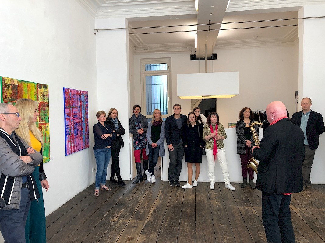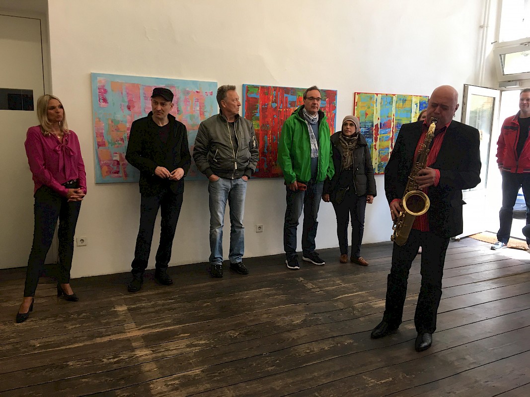 Kurt Buschmann, der Hamburger Künstler und Saxophonspieler begleitet die Vernissage musikalisch.