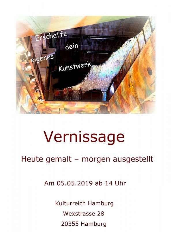 Am 4. Mai 2019 treffen sich acht Hamburger Kreative in der kulturreich Galerie zum Gestalten. Unter der Leitung des Hamburger Künstlers Be´shan malen sie den Tag über in dem Workshop, wobei der Prozess selbst das Thema ist. Es wird gerakelt und gespachtelt in großen Formaten. Bilder mit abstraktem Charakter und mehreren Farbschichten werden entstehen. Emotionale Malerei mit kontrastreichen Farben – das erwartet die Besucher*innen am folgenden Tag bei der Vernissage, die Ergebnisse eines einmaligen Prozesses, abstrahiert festgehalten auf den Leinwänden.