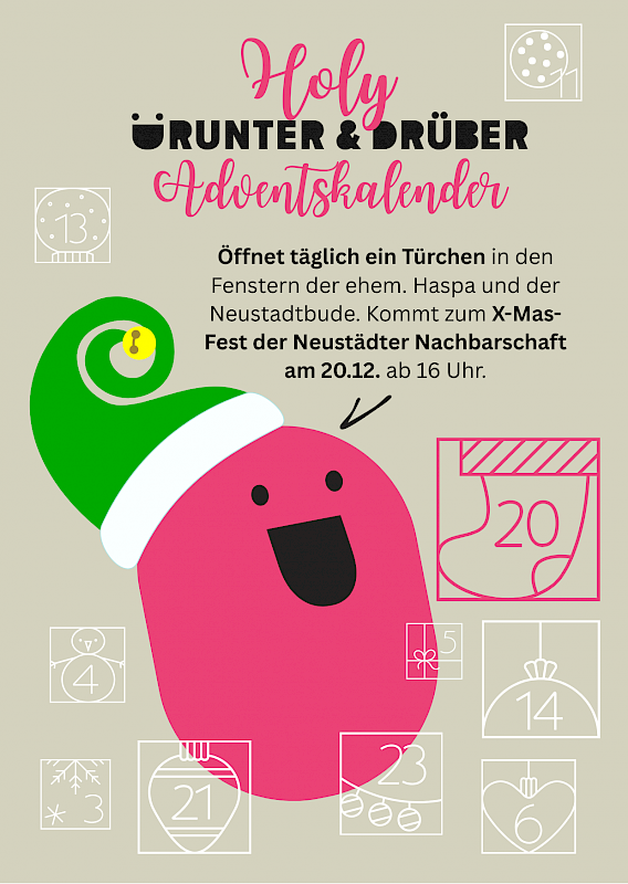 Wie jedes Jahr lädt das traditionelle Holy Drunter & Drüber am 20. Dezember zur weihnachtlichen Begegnung an der Neustadtbude ein – mit Kekstauschbörse, X-Mas-Singen, Punsch, Pingpong und allem, was die Nachbarschaft an Ideen mitbringt.